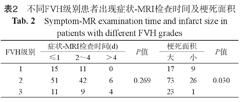 | FVH级别 | 症状-MRI检查时间(d) | P值 | 梗死面积 | P值 | |||