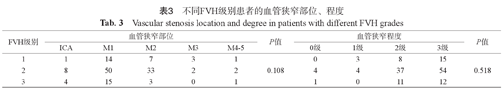 表1得出结论,FVH的出现与患者症状-MRI检查时间、血管狭窄部位、程度及梗死面积有关。再将FVH阳性组分级研究,结果显示FVH不同级别间患者症状-MRI检查时间、血管狭窄部位及程度差异不具有统计学意义(P=0.269,P=0.108,P=0.518)(表2、表3)。而FVH不同级别间患者梗死面积差异仍具有统计学意义(χ2=7.026,P=0.030)(表2),FVH 1级大面积梗死患者65.38% (17/26),2级73.74% (73/99),3级95.83% (23/24),可见FVH级别越高,大面积梗死患者占比越大。