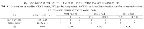 22例患者中,预后良好组13例,预后不良组9例,两组间基线FVH级别及治疗后血管再通差异无统计学意义(P=0.290,P=0.080),基线NIHSS评分和治疗后FVH消失情况差异具有统计学意义(P=0.000,P=0.002) (表4)。