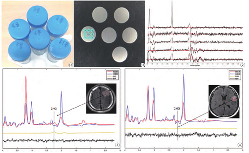 配制包含不同代谢物的两组体外水模,于T2WI液体衰减反转恢复序列(fluid attenuated inversion recovery,FLAIR)像上对各水模中心位置进行MRS感兴趣定位,采用长TE PRESS序列进行MRS成像。使用相同扫描参数,结合患者T1WI、T1WI增强图像,对拟诊为低级别胶质瘤的4例患者进行脑MRS成像,以术后基因检测获得的IDH基因突变状态作为金标准。水模及在体波谱中代谢物的绝对浓度值均通过LC model软件拟合后获得。