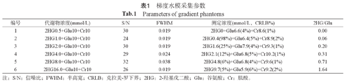 配置体外水模1(PH=7.0),加入N-乙酰天冬氨酰酸(N-acetylaspartate,NAA,12.5 mmol/L)、肌酸(creatine,Cr,10.0 mmol/L)、胆碱(choline,Cho,3.0 mmol/L)、2HG (9 mmol/L)、谷氨酸(glutamate,Glu,12.5 mmol/L)、谷氨酰胺(glutamine,Gln,12.5 mmol/L)、γ-氨基丁酸(γ-aminobutyric acid,GABA,2.0 mmol/L)。