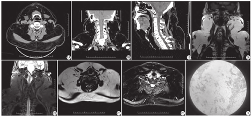 马德龙病(Madelung's disease,MD),由于脂肪代谢异常引起大量无包膜脂肪组织堆积于颈项肩部皮下,常呈对称性,并可沿颈部肌肉间隙向深处延续[1],较罕见,好发于地中海地区[2]。该病发病机制并不十分明确,根据文献报道,可能与长时间酗酒、内分泌异常及染色体变性有关[3]。MD病史长,发病迟缓,缺乏特异性病征,患者常由于局部变形影响生活质量而就诊,病变位于颈部者也会因脂肪堆积过多压迫气管或食管导致呼吸、吞咽困难,部分患者合并有神经系统损害,以周围神经病变为多[4],属于一种良性病变,但不排除恶变可能[5]。MD有3种分型:Ⅰ型多为中老年男患者,脂肪集聚在项部、颈部、肩部及上肢,呈"河马颈"、"驼峰背"等外在表现,常对称分布,无痛质软;Ⅱ型男女发病百分比相同,突出表现为全身脂肪组织积聚,背部、臀部及大腿上部尤多,呈"大力水手"、"假运动员"外观,常伴有体重增加,与肥胖症不易区分;Ⅲ型儿童多见,表现为躯干周围脂肪淤积,属先天性[6]。本例患者依据分型标准,诊断为Ⅰ型MD。