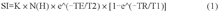 其中,SI可测量获得,K为常数,N (H)代表质子密度,TR及TE为已知参数。当TE值为0 ms时,所得的信号强度代表了质子信号强度。若在同一个TR时间内,采集两个以上回波(2个TE),得到两个以上的对比度图像,则可以通过解方程组算出T2值,通过计算每个像素的T2值而获得T2灰度图或伪彩图。