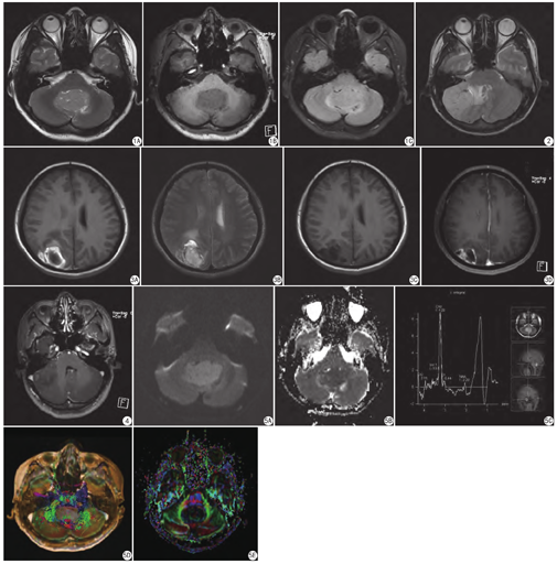 1例位于桥小脑角区,1例位于右枕顶叶伴出血,7例位于小脑半球,6例位于蚓部-四脑室,1例多发;8例有小血管穿行。肿瘤均有囊变,实性成分T1WI呈等或稍低信号,T2WI及液体衰减反转恢复序列(fluid attenuated inversion recovery,FLAIR)序列呈等或稍高信号;扩散加权成像(diffusion weighted imaging,DWI)为高信号,平均ADC值为0.589×10-3 mm2/s;5例中度强化,4例明显强化,5例斑片状或片絮样轻度强化。7例有磁共振波谱(MR spectroscopy,MRS),Cho峰明显升高,NAA峰明显降低,Cho/NAA值(≥4.8)明显增高;3例行扩散张量成像(diffusion tensor imaging,DTI)检查,瘤周白质纤维束推移、部分断裂。