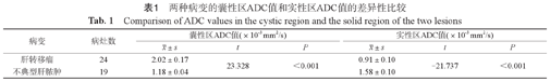 本次分析采用统计学软件SPSS 22.0对肝脓肿、肝脏转移瘤两种病变的囊性成分ADC值和实性成分ADC值进行差异性比较,均采用两独立样本t检验,P<0.05表示差异有统计学意义。