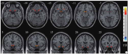 PDM患者较健康对照组VMHC值显著增加的脑区位于双侧膝下皮层和眶额区(峰值=5.5541,体素大小=42),见图1,而未发现VMHC值显著降低的脑区。