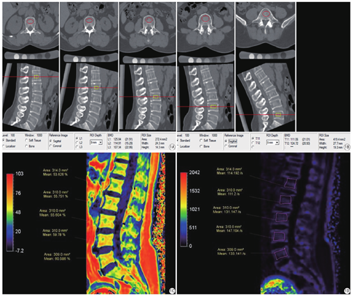 用飞利浦Ingenia CX 3.0 T MRI设备行腰椎mDIXON-Quant检查。采用8通道腹部线圈。扫描参数:TR 8.0 ms,TE 1.45 ms,FOV:156 mm×360 mm,反转角3°,三维图像分辨率:2 mm×2 mm×6 mm,敏感度编码(sensitivity encoding,SENSE)为2,信号平均次数(number of signalaveraged,NSA)为1次,扫描时间20 s。测量图像选择经过腰椎体(L1-L5)正中矢状位,手工绘制感兴趣区测量FF(单位:%)、R2* (单位:/s),感兴趣区尽量在椎体最大层面的中心部分,避开无关部分,并根据不同椎体的大小调整感兴趣区面积大小,见图1C、图1D。