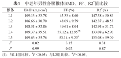 男、女性中老年人L1-L5各椎体间BMD、R2*比较,差异均无明显统计学意义(P>0.05)。男、女性中老年人L1-L5各椎体间FF比较,差异均有统计学意义(P<0.05),其中男女性L4FF、L5FF均大于L1FF,男性L4FF大于L2FF,见表1、表2。