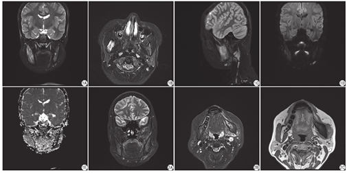 本组9例SAPHO综合征,8例为儿童/青少年。磁共振表现为不同程度的下颌骨受累,主要累及单侧下颌支及下颌角,并邻近体部,上颌骨未见受累。9例均出现骨髓水肿,其中8例不对称。7例合并骨质肥厚,均为髓质部受累。5例合并周围软组织水肿,其中1例累及邻近肌群,9例均出现周围多发淋巴结。1例行扩散加权成像检查,未见明确扩散受限。