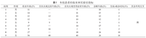 | 病例 | 性别 | 检查年龄(岁) | 首次出现皮疹年龄(岁) | 首次出现骨质症状年龄(岁) | 诊断年龄(岁) | 发病-确诊时间(年) | 其余外周关节 |