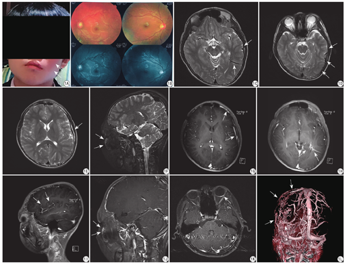患者男,12岁。A:左侧面颊部红斑痣;B:眼底照相检查左侧眼部血管增多、迂曲;C:轴位T2WI平扫左侧颞叶脑表增粗、迂曲流空血管及左侧颞、枕交界区脑实质内发育异常流空血管;D:轴位T2WI平扫左侧颞叶脑表迂曲流空血管影;E:轴位T2WI平扫示左侧颞骨内板增厚;F:矢状位T2-tirm平扫示左侧面颊部皮下高信号迂曲血管;G:轴位T1WI增强扫描左侧额、颞叶脑表强化血管影;H:轴位T1WI增强扫描示左侧颞、枕交界区脑实质内强化引流血管影,向内延伸与左侧侧脑室后角脉络丛相通;I:矢状位T1WI增强扫描示颞叶脑表增多强化血管;J:矢状位T1WI增强扫描左侧面颊部皮下迂曲强化血管影;K:轴位T1WI增强扫描左侧眼球后壁增厚并强化;L:三维容积重建图示左侧颞、顶叶脑表迂曲增多血管,左侧颞、枕交界区一发育异常血管