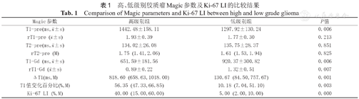 高、低级别胶质瘤Magic参数及Ki-67 LI的比较结果