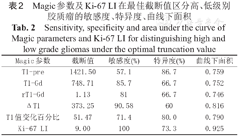 Magic参数及Ki-67 LI在最佳截断值区分高、低级别胶质瘤的敏感度、特异度、曲线下面积