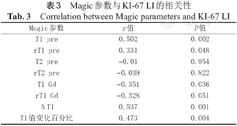 T1-pre (r=0.502,P=0.002)、rT1-pre (r=0.331,P=0.048)、T1-Gd (r=-0.351,P=0.036)、ΔT1 (r=0.537,P=0.001)、T1值变化百分比(r=0.473,P=0.004)均与Ki-67 LI具有显著相关性,均具有统计学意义。此外,其余各项参数与Ki-67 LI无明显相关性,详见表3。