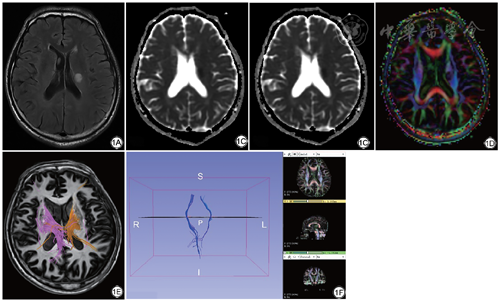 采用Extended MR WorkSpace 2.6.3.1工作站对DTI数据进行后处理,重建出表观扩散系数(apparent diffusion coefficient,ADC)图,各向异性系数(fractional anisotropy,FA)图,各向同性图(isotropic image),容积比各向异性(volume ratio aniso)图;分别在放射冠,半卵圆中心,内囊后肢选取感兴趣区ROI。选择感兴趣区后,软件显示相应FA值、ADC值、纤维束数量以及重建后的纤维束图像,使用3D slicer 10.4.2软件进行纤维束重建获得重建图像。