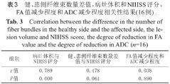 | 组别 | 病灶体积与NIHSS评分 | 健、患侧纤维束数量差值与NIHSS评分 | FA值减少程度和ADC减少程度 |