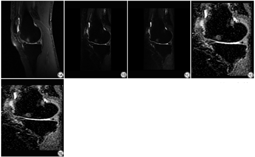 膝关节为人体下肢的负重关节,结构较复杂[1],骨挫伤为常见的膝关节损伤,骨挫伤主要由外伤引起,可导致患者出血、骨髓水肿、骨小梁骨折等[2, 3],但骨皮质及软骨处于正常状态,属于一种隐匿性疾病[4]。对于膝关节骨挫伤,X线检查无阳性征象而局部症状明显,行MRI是最佳影像学检查手段,其中扩散加权成像(diffusion-weighted imaging,DWI)通过ADC对骨髓病变进行定量分析[5]。但常规采用的全视野扩散加权成像(full field of view DWI,fFOV DWI)因扫描视野较大,且包含骨骼、软组织、液体、气体等物质使得场强不均匀,易受到磁敏感伪影、搏动伪影的干扰,导致图像质量的下降,甚至引起严重的形变[6, 7];小视野扩散加权成像(reduced field of view DWI,rFOV DWI)则采用2D空间选择性射频脉冲(2D radio frequency,2D RF)及180°回聚脉冲技术,应用价值较高[8],克服了fFOV DWI的诸多缺点,目前国内外已证实在肾上腺结节[9]、胆囊[10]、乳腺[11]、前列腺[12]、脊柱[13]等部位的可行性与应用价值,但在关节软骨和骨髓病变中的研究甚少。本文主要比较rFOV DWI与fFOV DWI序列在膝关节骨髓水肿的成像质量及参数值差异,分析rFOV DWI评价膝关节骨挫伤骨髓水肿的可行性。