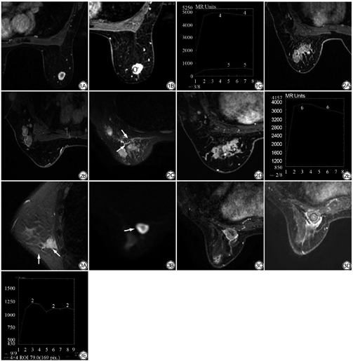 由两名具有5年以上乳腺MRI诊断经验的医师分别阅片,阅片前未知病理结果及患者资料。根据ACR BI-RADS标准对图像进行观察判断,意见不一致时进行协商后达成一致。