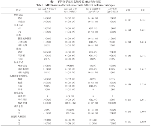 不同分子亚型乳腺癌的MRI表现特征
