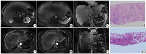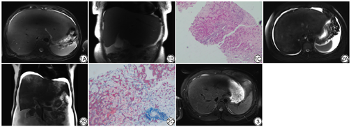 | MR T1WI/T2WI | 肝实质T1WI/T2WI信号均匀、细腻,肝“纹理”(肝实质内细小静脉等所形成的条形及同格样结构)减少(图1)。 | 肝实质T2WI信号不均匀增高,肝内见不规则片状或“云絮”状稍高信号影(图2)。另可见以第二肝门为中心环绕三支肝静脉和下腔静脉的“三叶草”样T1WI稍高T2WI稍低信号影 |