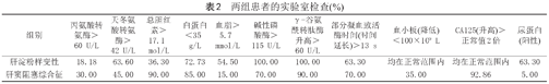 两组患者的甲、乙、丙、戊型肝炎、HIV病毒指标、自身免疫性肝炎抗体、血清蛋白电泳、风湿免疫检测均为阴性,余指标见表2。