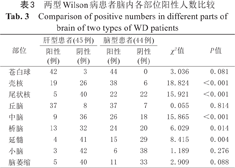 Comparison of positive numbers in different parts of brain of two types of WD patients
