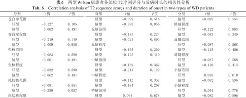 不同临床类型WD患者临床指标和MRI指标的相关性结果显示如表5:脑型WD患者发病时长与脑部MRI的T2序列评分呈正相关。肝型WD患者发病时长与脑部MRI的T2序列评分无相关性。两型发病年龄及确诊年龄与脑部MRI的T2序列评分无相关性。肝型、脑型WD患者颅脑各部位T2序列评分与发病时长无相关性(表6)。