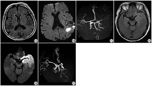 采用1.5 T Essenza MR扫描仪(德国Siemens公司)、4通道头颅线圈进行检查。扫描序列包括常规MR平扫、FLAIR序列成像、DWI和磁共振血管成像(MR angiography,MRA)。扫描参数为:(1)T1WI序列:重复时间(TR) 350.0 ms,回波时间(TE) 8.7 ms,层距5.0 mm,视野(FOV) 23 cm×23cm,矩阵320×320;(2)T2WI序列:TR 3800.0 ms,TE 107.00 ms,层距5.0 mm,FOV 23 cm×23 cm,矩阵256×256;(3) FLAIR序列:TR 8850 ms,TE 87.0 ms,层距5.0 mm,FOV 23 cm×23 cm,矩阵256×256;(4) DWI序列:TR 3400.0 ms,TE 105.0 ms,层距5.0 mm,FOV 23 cm×23 cm,矩阵160×160;(5) MRA序列:采用3D-TOF技术,TR 28.0 ms,TE 7.0 ms,反转角20°,FOV 24 cm×21 cm,矩阵256×224。