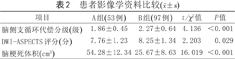 A组患者的脑侧支循环代偿分级、DWI-ASPECTS评分均小于B组,脑梗死体积大于B组,差异比较有统计学意义(P<0.05;表2)。典型病例见图1、2。