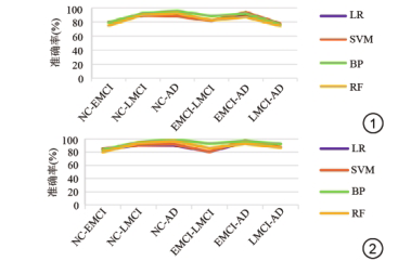 本研究将MCI分成EMCI和LMCI两个阶段,对NC、EMCI、LMCI、AD 4组进行两两分类,通过具体化分类更早识别MCI阶段进而能够对AD进行早期诊断,而以往的研究[16]只对NC、MCI、AD 3组进行两两分类,也涉及BP神经网络以及其他模型,然而在NC-AD组的分类准确率一般在80%~95%。
