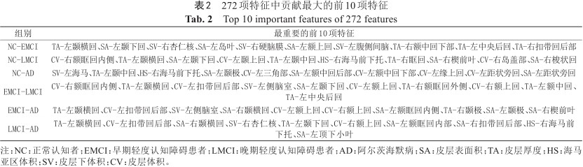 通过L1-SVM特征选择模型提取后,在识别NC与EMCI组时,有133项特征被提取并进入分类模型。其他NC-LMCI、NC-AD、EMCI-LMCI、EMCI-AD和LMCI-AD组中,分别有86、58、112、78和78项被提取。特征选择的结果根据它们对该分类组的重要程度来排列,本研究只显示各组前10项(见表2)。从整体来看,最主要的10项特征分别为TA-左颞横回、SA-左颞下回、SV-右杏仁核、CV-右额眶回内侧、TA-左颞中回、HS-右海马前下托、SA-左颞极、CV-右额上回、CV-左扣带回后部、SA-左额眶回内侧。