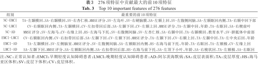 | NC-EMCI | TA-左颞横回、SA-右颞横回、SV-右杏仁核、MMSE评分、SV-左岛叶、SV-右硬脑膜、SA-左额上回、SV-左腹侧间脑、SA-左额眶回内侧、TA-右额中回下部 |