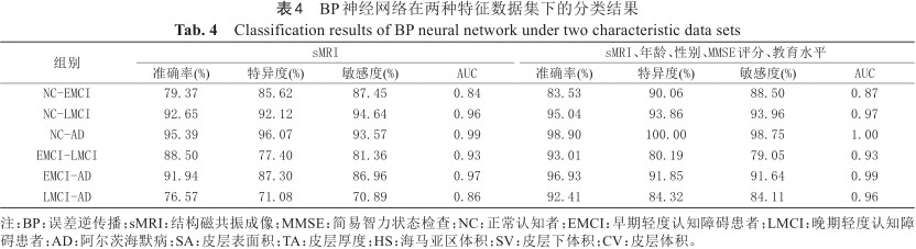 注:BP:误差逆传播;sMRI:结构磁共振成像;MMSE:简易智力状态检查;NC:正常认知者;EMCI:早期轻度认知障碍患者;LMCI:晚期轻度认知障碍患者;AD:阿尔茨海默病;SA:皮层表面积;TA:皮层厚度;HS:海马亚区体积;SV:皮层下体积;CV:皮层体积。