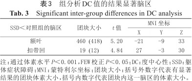 注:通过体素水平P<0.001,FEW校正P<0.05;DC:度中心性;SSD:躯体症状障碍;MNI:蒙特利尔坐标;团块大小:括号外数字代表有显著结果的团块体素大小,括号内数字代表团块内这一脑区的体素大小。