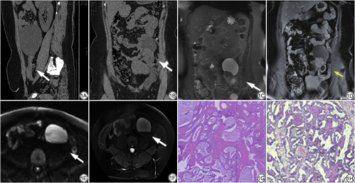 患者女,42岁,左卵巢子宫内膜样腺纤维瘤。A:2016年腹盆CT平扫:左腹部及左附件区囊状低密度影,内密度较均匀,病灶以较窄颈与左附件区相连(白箭);B:2021年腹盆平扫:腹腔左侧部团块状囊实性软组织密度灶,边界清,内见液液平面(白箭);C、D:2021年MRI示腹腔左侧部团块状囊实性信号影,T2WI示囊实性肿块(白箭),动态增强扫描病灶囊壁及实性部分可见轻度强化(黄箭);E:DWI示病灶大部(白箭)呈高信号;F:T2WI压脂病灶大部(白箭)呈高信号;G:2016年病理学标本(HE ×40),肿瘤呈腺管样,腺上皮为单层柱状上皮;H:2021年病理学标本(HE ×40),肿块部分区腺体拥挤,形态欠规整