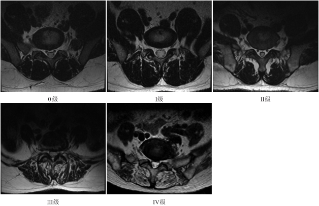 采用腰椎常规T2WI序列横断位,所有的操作均由2名3年肌骨放射诊断工作者协商一致目视评价。腰椎旁肌肉脂肪浸润分级根据Goutallier分级标准[10]:0级为无脂肪浸润,Ⅰ级为少量脂肪浸润,Ⅱ级为肌肉量大于脂肪浸润量,Ⅲ级为肌肉量等于脂肪浸润量,Ⅳ级为脂肪浸润量大于肌肉量(图1)。