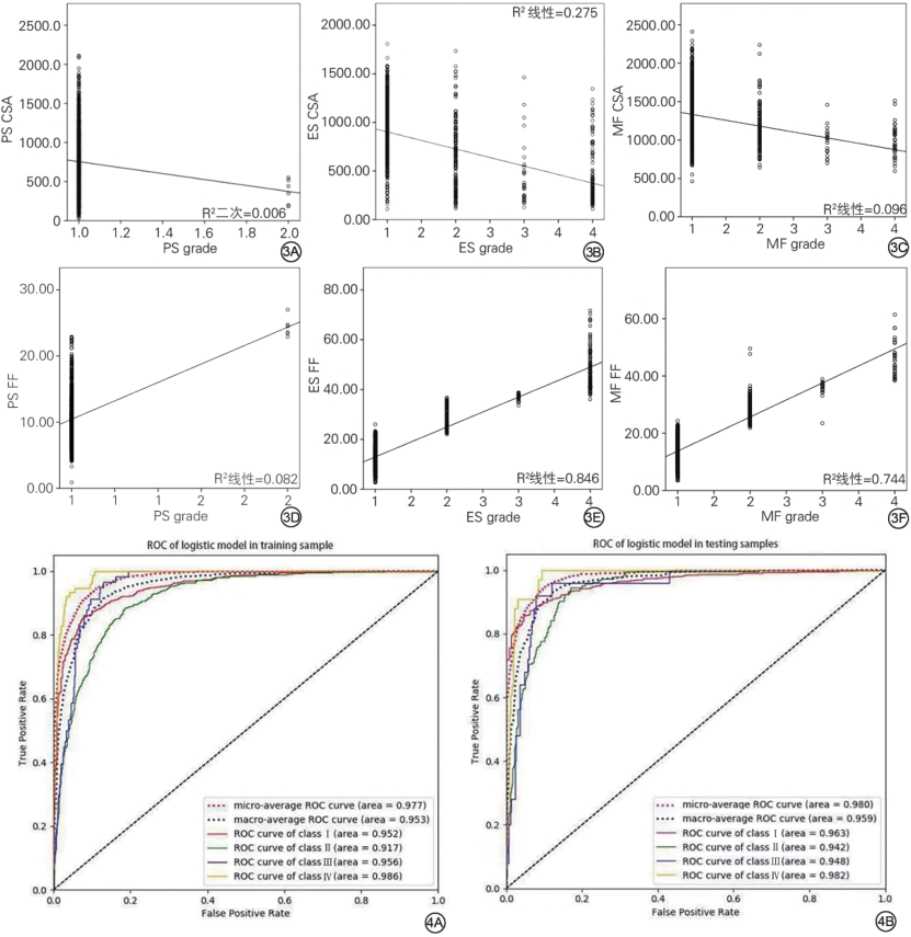 训练集下纹理参数特征对腰椎旁肌肉Goutallier分级Ⅰ级、Ⅱ级、Ⅲ级、Ⅳ级综合诊断的ROC曲线下面积分别为0.952、0.917、0.956、0.986,测试集下相应的ROC曲线下面积分别为0.963、0.942、0.948、0.982 (图4A~4B)。提取出纹理参数特征与椎旁肌肉FF值均具有相关性,其中MeanValue、Quantile0.975、Variance与椎旁肌肉FF呈显著相关(相关系数分别为0.887、0.777、0.776),VoxelValueSum、kurtosis、skewness、uniformity、HaralickCorrelation_angle135_offset7、HaralickCorrelation_angle90_offset4、InverseDifferenceMoment_AllDirection_offset4与椎旁肌肉FF呈强相关(相关系数分别为0.609、-0.687、-0.569、0.601、0.633、0.714、-0.604),ClusterShade_AllDirection_offset7与椎旁肌肉FF呈中等相关(相关系数为0.497)。
