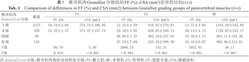 注:Goutallier分级:椎旁肌肉脂肪浸润程度分级;PS:腰大肌;MF:多裂肌;ES:竖脊肌;FF:脂肪含量;CSA:横截面积。