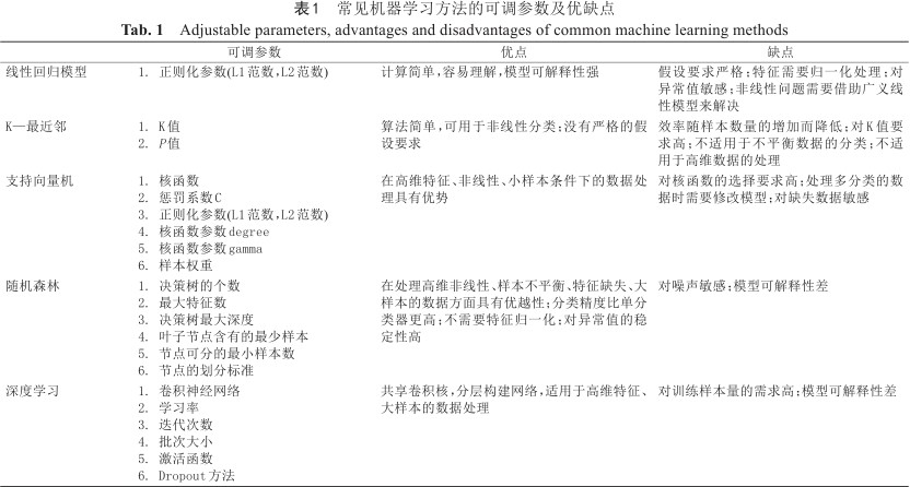 | 深度学习 | 1. 卷积神经网络 2. 学习率 3. 迭代次数 4. 批次大小 5. 激活函数 6. Dropout方法 | 共享卷积核,分层构建网络,适用于高维特征、大样本的数据处理 | 对训练样本量的需求高;模型可解释性差 |