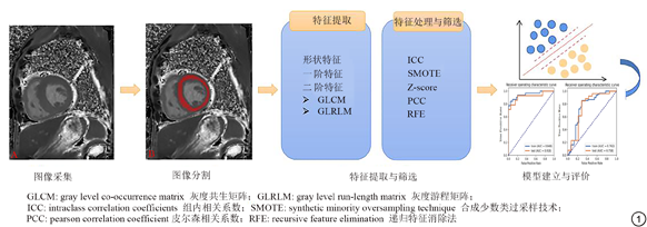 由两位分别有4年和6年工作经验的放射科医生采用手动分割法进行图像分割。将所有受试者的MRI图像以DICOM格式进行保存,图像分割采用ITK-SNAP软件。选择native T1 mapping序列短轴位上心肌中间层面的map图像载入软件,在左室中间层心肌勾画感兴趣区(region of interest,ROI),如图1B所示。ROI的勾画需要避开血池和乳头肌,防止产生噪声和部分容积效应。将勾画的ROI图像及原始图像以.nii格式进行保存,选择FeAture Explorer (FAE,V0.3.7)软件[11]进行特征提取。提取特征包括形状特征、一阶直方图特征及灰度共生矩阵(gray level co-occurrence matrix,GLCM)和灰度游程矩阵(gray level run-length matrix,GLRLM)等二阶特征。