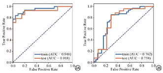 SVM模型A训练集与测试集的敏感度、特异度、阳性预测值、阴性预测值、准确度分别为:0.839、0.957、0.929、0.898、0.909和0.786、0.950、0.917、0.864、0.882,训练集与测试集的AUC分别为:0.948 (95% CI:0.890~0.991)、0.918 (95% CI:0.780~1.000)。SVM模型B训练集与测试集的敏感度、特异度、阳性预测值、阴性预测值及准确度分别为:0.853、0.710、0.853、0.710、0.804和0.846、0.714、0.846、0.714、0.800;训练集与测试集的AUC分别为:0.762 (95% CI:0.639~0.875)、0.758 (95% CI:0.565~0.937)。