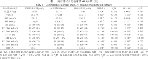 注:BMI:身体质量指数;SBP:收缩压;DBP:舒张压;LV:左室;RV:右室;EDVi:舒张末期容积指数;ESVi:收缩末期容积指数;EF:射血分数;LVMI:左室心肌质量指数;a:χ2值;b:t值;c:Z值;统计值1与P1值:有无延迟强化组进行比较;统计值2与P2值:无延迟强化组与健康对照组进行比较;1 mmHg=0.1333 kPa。
