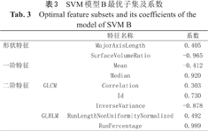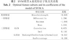 对两位医生提取的无延迟强化组与延迟强化组特征集经过一致性检验(ICC≥0.8)筛选出41个特征,数据按照7∶3的比例随机分为训练集(92例)和测试集(40例),训练集特征经过同样的降维方式,最后得出9个最优特征子集,其中形状特征有2个,分别为MajorAxisLength、SurfaceVolumeRatio;一阶特征有2个,分别为Mean、Median;GLCM特征有3个,分别为Correlation、Id、InverseVariance;GLRLM特征有2个,分别为RunLengthNonUniformityNormalized、RunPercentage。各纹理特征及相应系数如表3。最后基于这9个特征子集及其对应的系数构建SVM模型B,预测CA患者心肌有无延迟强化。