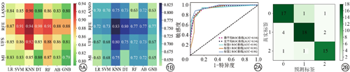 选用7种有监督机器学习分类算法:逻辑回归(logistic regression,LR)、支持向量机(support vector machine,SVM)、随机森林(random forest,RF)、K近邻(K nearest neighbor,KNN)、决策树(decision tree,DT)、高斯朴素贝叶斯(GaussianNB,GNB)和Adaboost集成分类器(Adaptive Boosting,AB)。将上述7种机器学习算法所对应的分类器与1.3.3中的4种特征选择方法两两组合,共建立28 (4×7=28)个分类预测模型,并以“特征选择方法-机器学习分类器”的模式对其进行命名,如结合RFE特征选择法和KNN分类器所建立的模型,则命名为“RFE-KNN”。将所有病例数按8∶2.随机划分为训练集和测试集,利用3次10折交叉验证对模型进行训练,并在测试集上进行验证,获取测试集的ROC曲线和分类混淆矩阵。