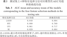 表3为测试集上4种特征选择方法中的每一种方法单独与7种分类器相结合所构建的7个分类模型的AUC和准确度均值,以比较单一特征选择方法在本数据集上的分类预测性能。可见,4种特征选择方法中表现最优的为RFE,AUC均值和准确度均值分别为0.899和0.760。