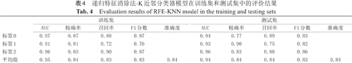 表4为RFE-KNN模型在训练集和测试集上各项评价指标的得分情况,图中标签0代表良性肿瘤,标签1代表交界性肿瘤,标签2代表恶性肿瘤。训练集上良性组、交界性组和恶性组的AUC分别为0.97、0.91和0.96,测试集上良性组、交界性组和恶性组的AUC分别为0.94、0.93和0.96。