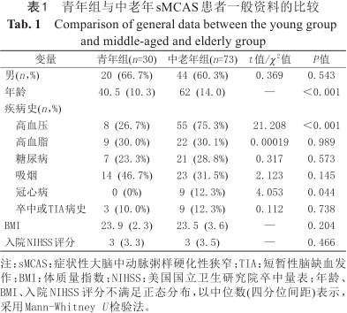 103例患者纳入分析,其中青年患者30例,平均年龄40.5岁,中老年患者73例,平均年龄62岁。两组患者在年龄(P<0.001)、高血压(t=21.208,P<0.001)和冠心病(t=4.053,P=0.044)方面差异有统计学意义,而在性别、高血脂、糖尿病、吸烟、卒中或TIA病史、BMI、入院NIHSS评分上,两组间差异无统计学意义(P>0.05),见表1。