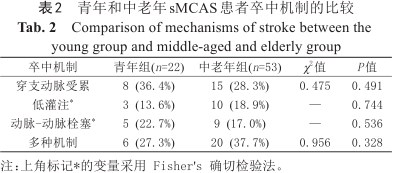 本研究结果与陈红兵等[20]的研究结果相似,即青年与中老年sMCAS患者在卒中机制方面差异无统计学意义。该结果可能与研究入选的sMCAS患者责任血管狭窄程度均为中度或重度狭窄有关,由于重度狭窄患者更容易发生低灌注,这将导致研究对象的致卒中机制存在重叠。因此,未来有必要针对不同狭窄程度的患者进行分组,独立观察两组患者在卒中机制方面的差异。