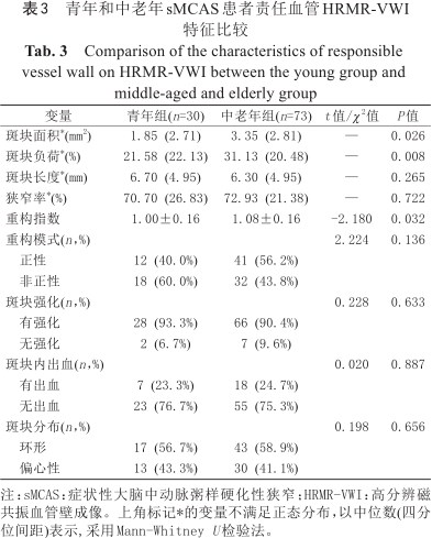 青年和中老年sMCAS患者责任血管HRMR-VWI特征比较