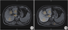 使用Siemens Amira 1.5 T MR扫描仪,13通道表面相控阵腹部线圈进行MR扫描,在MR检查前患者保持空腹状态,进行吸气屏气训练。采用高压注射器自肘静脉注入Gd-EOB-DTPA (Primo-vist; Bayer Schering Pharma AG, Berlin, Germany),注射剂量约10 mL (0.025 mmol/kg),注射速率为2 mL/s,然后以相同速率注射20 mL生理盐水冲洗,注射Gd-EOB-DTPA后20 s获得动脉期图像、门脉期55 s、平衡期3 min、肝胆期20 min。增强前后的TIWI扫描采用多回波三维容积内插水脂分离快速扰相(three dimensional multi-echo Dixon volumetricinterpolated breath-hold examination, Dixon-VIBE)序列,具体参数为:TR=6.73 ms,TE=2.39 ms,反转角=12°,带宽=490 HZ,视野=380 mm×400 mm,层厚=3 mm。